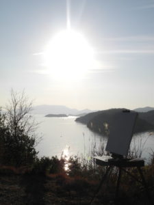 この日は、三日連続して出崎の同じポイントでイーゼルを立てた。天気に恵まれて、三日間とも朝陽と光る海がまぶしい。今日は、期待したモチーフの状況と、予定していた描く絵の想定が一致したので、スンナリと気持ちよく描画を終えた。アトリエ画と違って、イーゼル画は直接、外での自然に含まれて仕事をするので、雨風、暑さ寒さ、蚊やアブ、イーゼルを立てる場所、眺望などクリアしなければならないハードルは結構多いのだ。だから、こんな日は、こんなに美しい風景を、こんなに楽に描かせてもらって、アリガタイという気持ちよりも、なんだか天に金利と返済期限と返済義務のない借金をしている気になる。美しい絵を描かなければ申し訳ない。